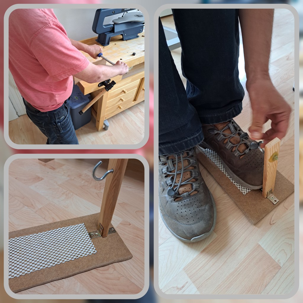 Also haben wir gemeinsam getüftelt und gewerkelt und ein Hilfsmittel gebaut, dass es erlaubt, den Schuh nur mit Hilfe einer Hand fest zu verschließen. Indem er seinen Fuß auf die Vorrichtung stellt, die Öse in den Haken hängt, am Verschluss zieht und anschließend die Öse wieder aushängt kann der Klient seine Schuhe nun fest am Fuß tragen. Er ist sehr zufrieden und hat dieses Hilfsmittel nahezu täglich im Einsatz.